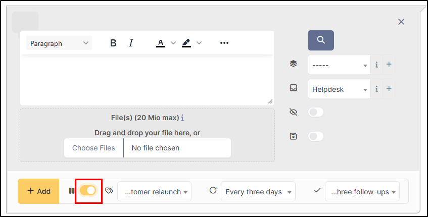 * **Calendrier** : sélectionnez un calendrier afin que les rappels soient envoyés conformément aux heures de travail de l'entreprise ;