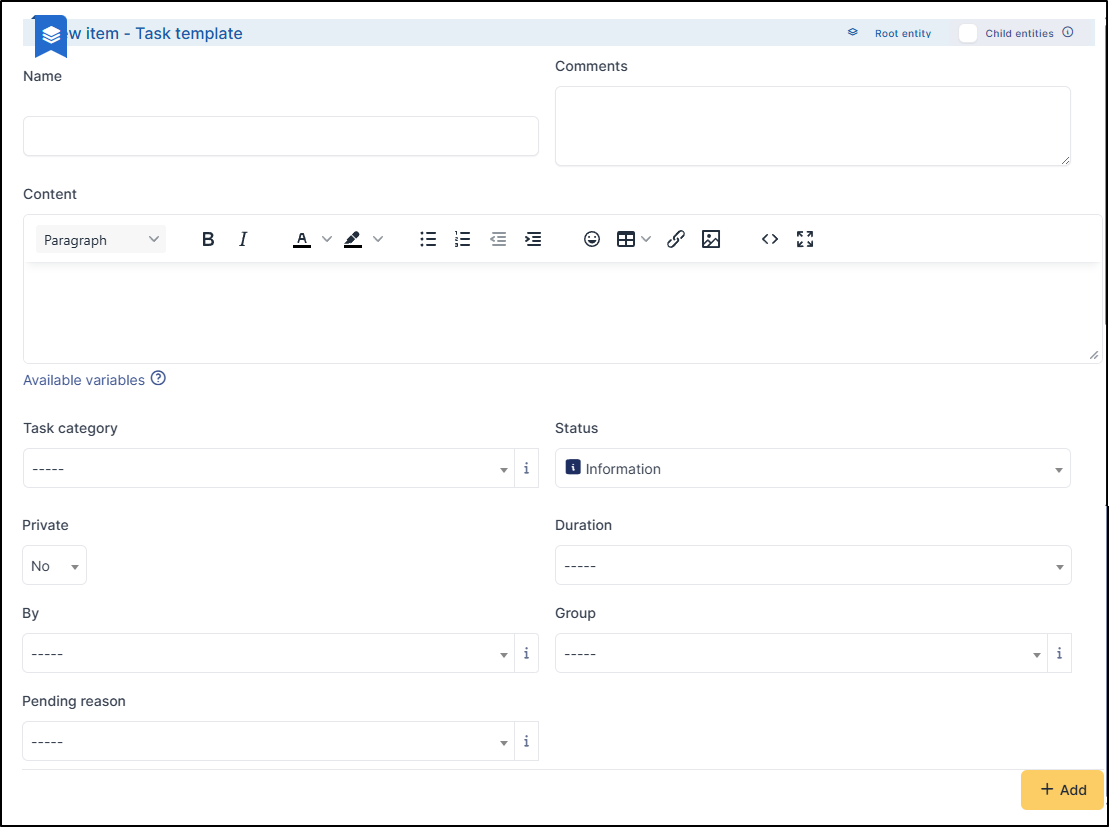 Les modèles simplifient le processus de création d'une tâche (pour les tâches récurrentes, par exemple). Lors de la création d'une tâche, il suffit de sélectionner le modèle approprié et les informations seront remplies automatiquement.