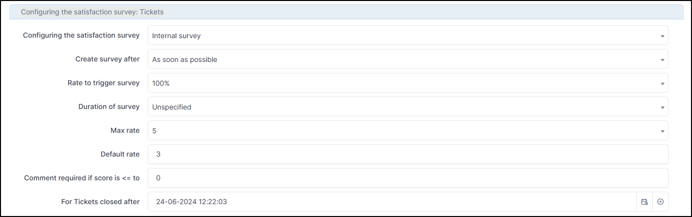 Survey can be internal (GLPI satisfaction form) or delegated to a third-party tool. For each entity, the survey date can be defined (delay after ticket closure) as well as to be generated survey rate. In order to avoid that old tickets are taken into account when activating survey, a field *For Tickets Closed After* contains the activation date to know which tickets must be taken into account. Indeed, if survey are reactivated after a deactivation time, this field must be set to exclude old tickets. For external survey, the URL of the survey can be generated automatically using tags defined below.