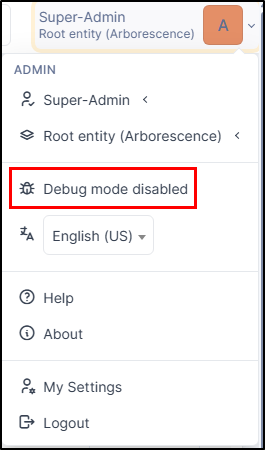 1. Enable **debug mode** in GLPI: go to **My Preferences**, then click **Debug Mode: Disabled** to activate it.