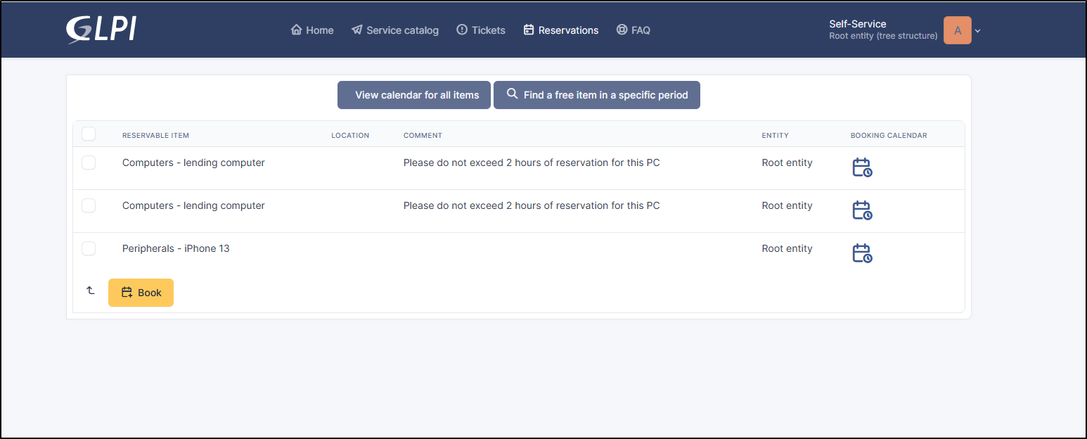 Several items can be reserved in GLPI (computers, monitors, peripherals, etc.). All you have to do is go to the equipment you want to appear in the reservations and in the **`Reservations`** tab click on **`Allow reservations`**. Each piece of equipment will have a booking schedule that can be consulted.