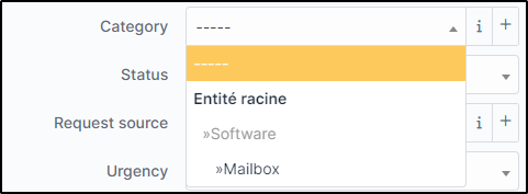La visibilité indique si la catégorie sera sélectionnable depuis l'interface d'assistance. Si elle est définie sur **`non`**, la catégorie sera visible mais non sélectionnable. Par exemple, pour limiter la sélection des catégories racines et forcer les utilisateurs à affiner leur demande en sélectionnant une catégorie enfant (plutôt que **`logiciel`** choisir **`logiciel`** > **`email`**).